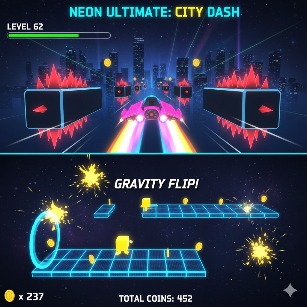 About the Game: Welcome to Neon Ultimate Dash, a fun and addictive rhythm game made for Android and PC. Test your skills and see how high you can score! I created this game as a tribute to classic games like geomentry lite dash, but with my own twist.